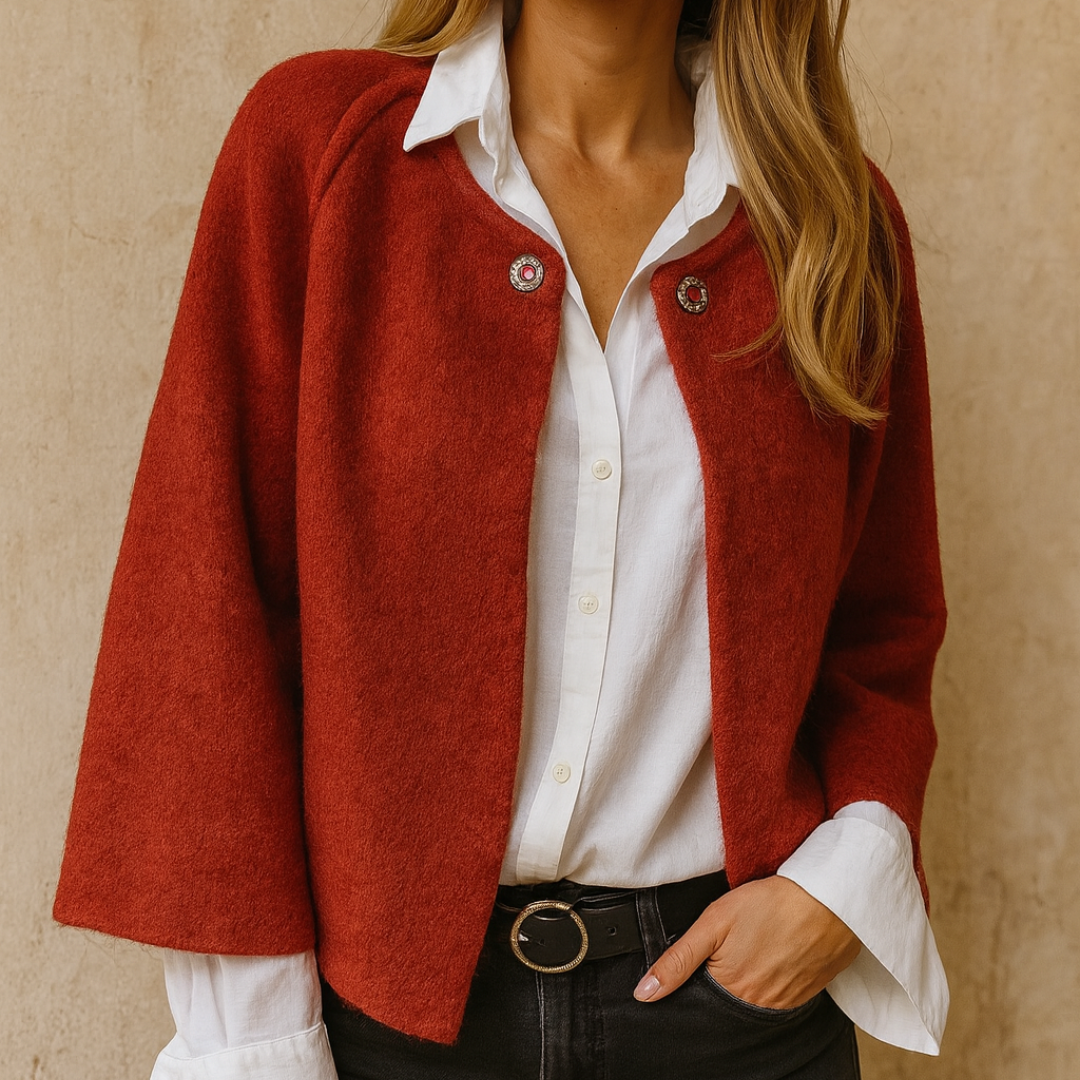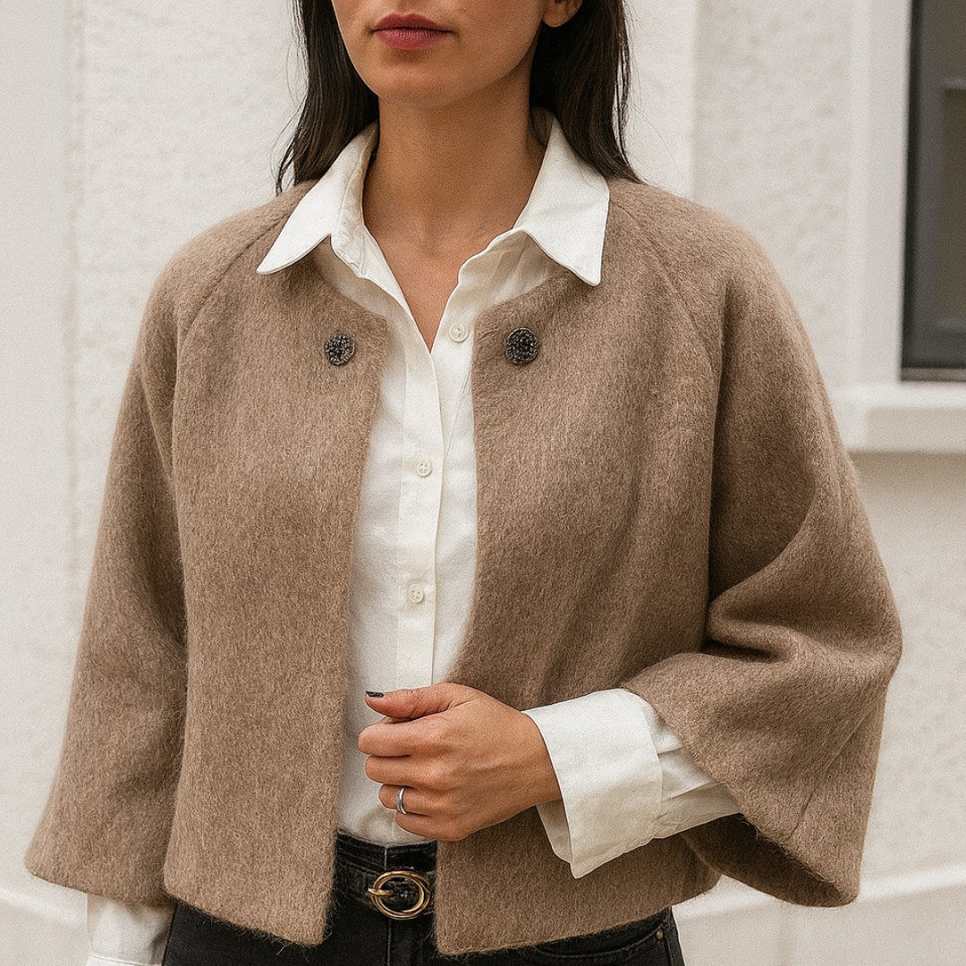 Diese elegante, kurze Mantel aus weichem Mohair-Effekt-Stoff ist das perfekte Kleidungsstück, um deinen Alltagsoutfits einen Hauch von Klasse zu verleihen. Mit einer bequemen Passform und weiten Ärmeln lässt sie sich leicht mit Hemden oder Tops kombinieren und sorgt für einen modernen, eleganten Look.
