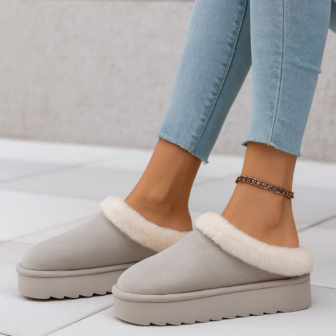Weich und bequem bieten diese Hausschuhe Wärme und Stil in jedem Moment der Entspannung. Aus Wildlederimitat mit weichem Kunstfellfutter gefertigt, umhüllen sie den Fuß mit einem angenehmen Tragegefühl. Die dicke, rutschfeste Sohle sorgt für Stabilität und Langlebigkeit und macht sie ideal für den täglichen Gebrauch im Haus oder im Freien. Ein unverzichtbares Accessoire, um die kälteren Tage mit Eleganz zu genießen.